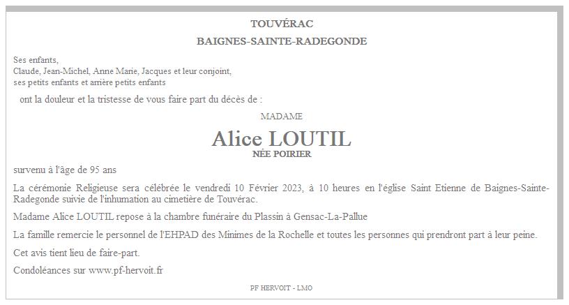 Cet espace « condoléances » est dédié à la mémoire de Madame Alice LOUTIL née POIRIER.
