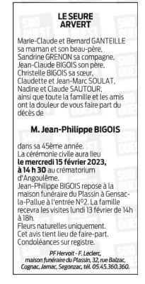 Cet espace « condoléances » est dédié à la mémoire de Monsieur Jean-Philippe BIGOIS.