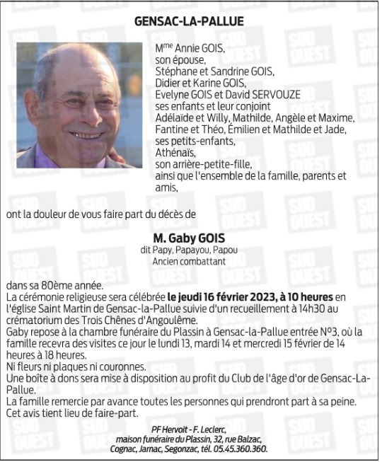 Décédé à Gensac-la-Pallue (16130) le vendredi 10 février 2023