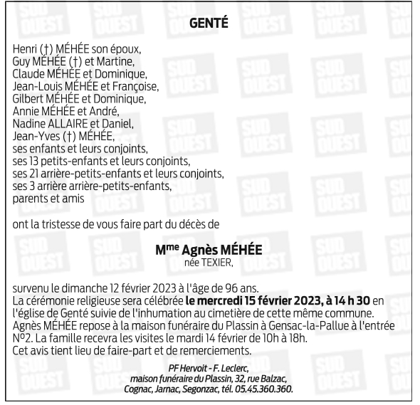 Cet espace « condoléances » est dédié à la mémoire de Madame Agnès MÉHÉE.