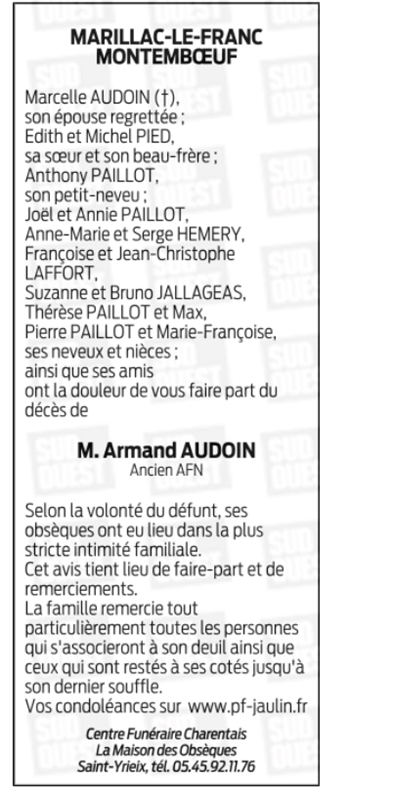 Cet espace « condoléances » est dédié à la mémoire de Monsieur Armand AUDOIN.