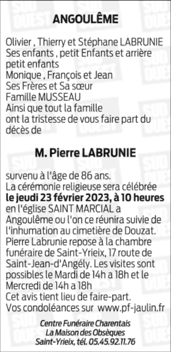 Cet espace « condoléances » est dédié à la mémoire de Monsieur Pierre LABRUNIE.
