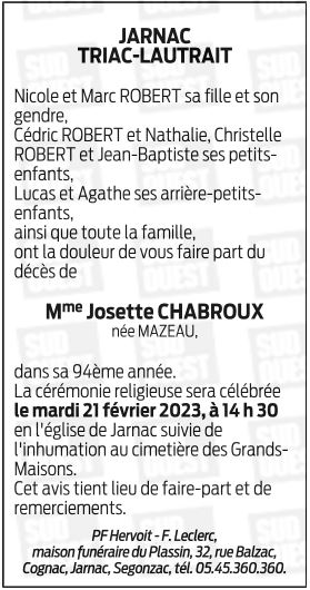 Cet espace « condoléances » est dédié à la mémoire de Madame Josette CHABROUX née MAZEAU.