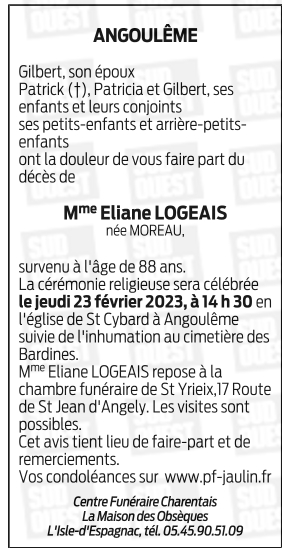 Cet espace « condoléances » est dédié à la mémoire de Madame Eliane LOGEAIS née MOREAU.