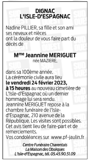 Cet espace « condoléances » est dédié à la mémoire de Madame Marguerite MÉRIGUET née MAZIÈRE.