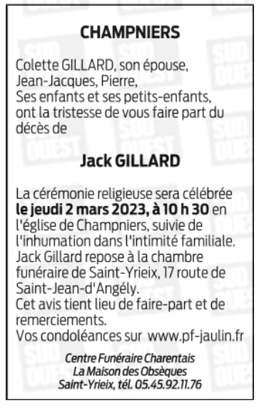 Cet espace « condoléances » est dédié à la mémoire de Monsieur Jack GILLARD.
