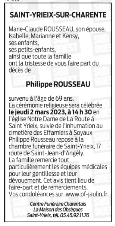 Cet espace « condoléances » est dédié à la mémoire de Monsieur Philippe ROUSSEAU.