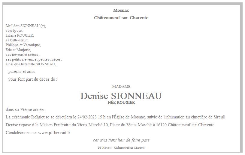 Cet espace « condoléances » est dédié à la mémoire de Madame Denise SIONNEAU née ROUGIER.