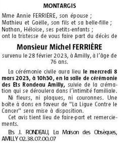 Cet espace « condoléances » est dédié à la mémoire de Monsieur Michel FERRIÈRE.