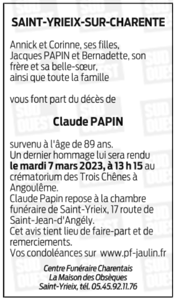 Cet espace « condoléances » est dédié à la mémoire de Monsieur Claude PAPIN.
