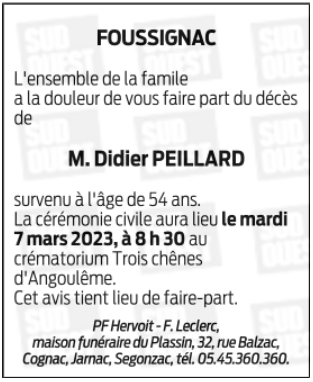 Cet espace « condoléances » est dédié à la mémoire de Monsieur Didier PEILLARD.