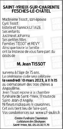 Cet espace « condoléances » est dédié à la mémoire de Monsieur Jean TISSOT.