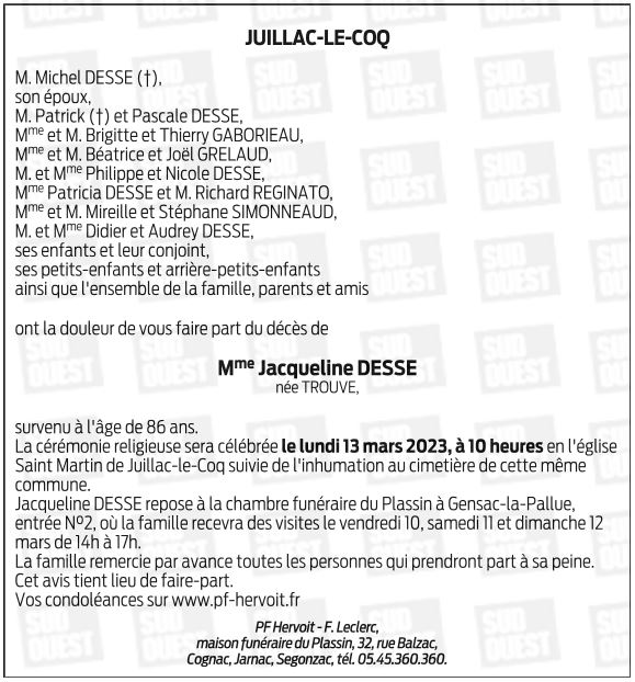de Madame Jacqueline DESSE née TROUVÉ