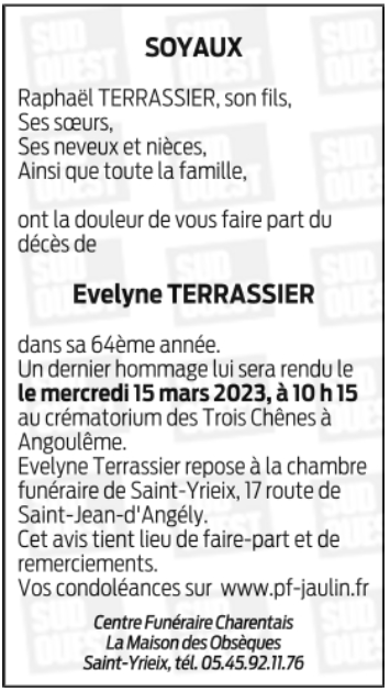 Cet espace « condoléances » est dédié à la mémoire de Madame Evelyne TERRASSIER née RIVRET.