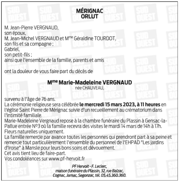 de Madame Marie-Madeleine VERGNAUD née CHAUVEAU