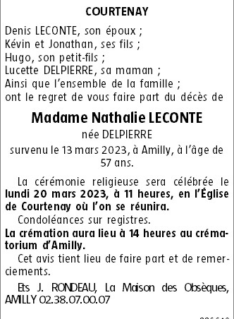Cet espace « condoléances » est dédié à la mémoire de Madame Nathalie LECONTE née DELPIERRE.