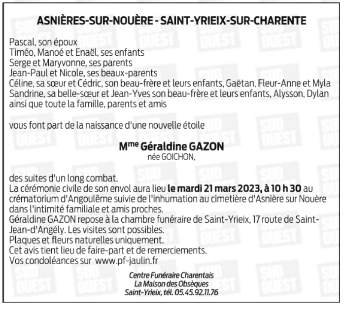 Cet espace « condoléances » est dédié à la mémoire de Madame Géraldine GAZON née GOICHON.