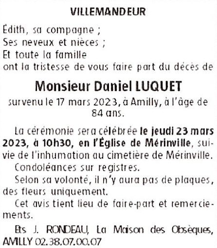 Cet espace « condoléances » est dédié à la mémoire de Monsieur Daniel LUQUET.
