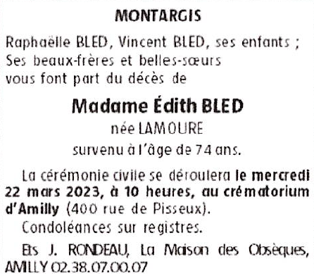 de Madame Edith BLED née LAMOURE