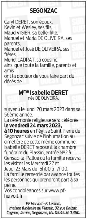 de Madame Maria Isabelle DERET née DE OLIVEIRA