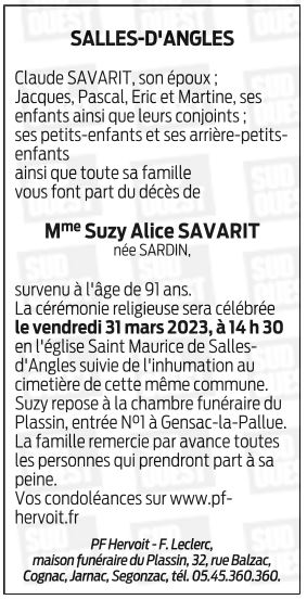 Cet espace « condoléances » est dédié à la mémoire de Madame Alice SAVARIT née SARDIN.