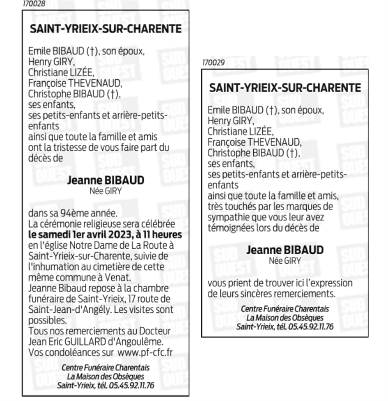 de Madame Jeanne BIBAUD née GIRY