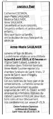 Décédée à Angoulême (16000) le dimanche 2 avril 2023