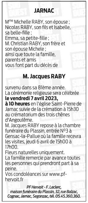 Cet espace « condoléances » est dédié à la mémoire de Jacques RABY.