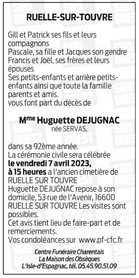 Cet espace « condoléances » est dédié à la mémoire de Madame Huguette DEJUGNAC née SERVAS.