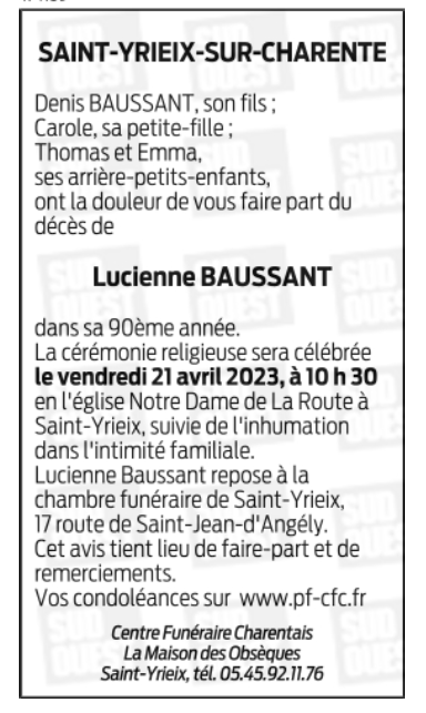 Cet espace « condoléances » est dédié à la mémoire de Madame Lucienne BAUSSANT née LAFORGE.