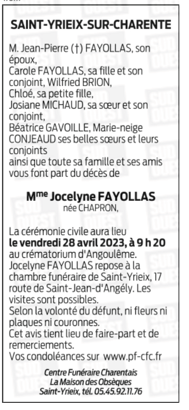Cet espace « condoléances » est dédié à la mémoire de Madame MARIE-ANNE JOCELYNE FAYOLLAS née CHAPRON.