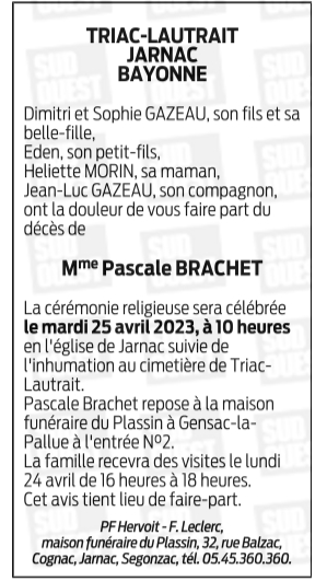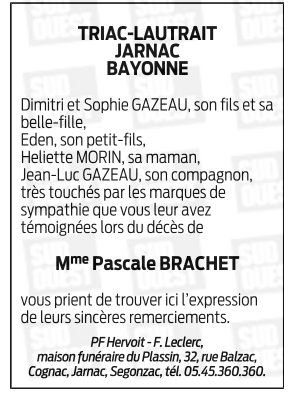 Cet espace « condoléances » est dédié à la mémoire de Madame Pascale BRACHET.