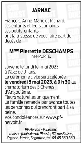 Cet espace « condoléances » est dédié à la mémoire de Madame Pierrette DESCHAMPS née PORTE.