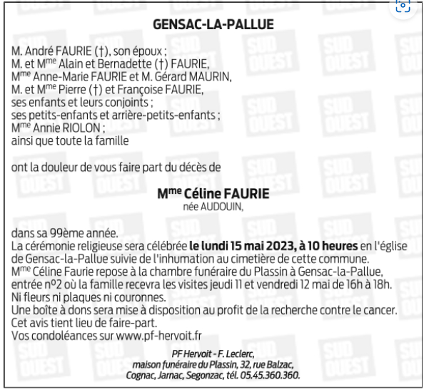 Cet espace « condoléances » est dédié à la mémoire de Madame Céline FAURIE née AUDOIN.