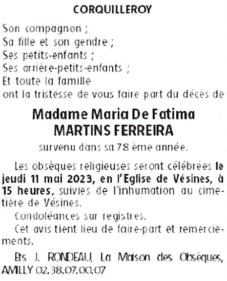 Cet espace « condoléances » est dédié à la mémoire de Madame Maria De Fatima MARTINS FERREIRA.
