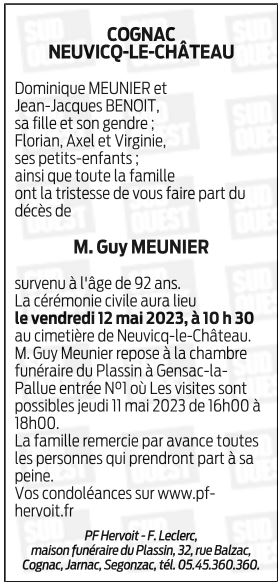 Cet espace « condoléances » est dédié à la mémoire de Monsieur Guy MEUNIER.