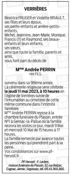 Cet espace « condoléances » est dédié à la mémoire de Madame Andrée PERRIN née FILS.