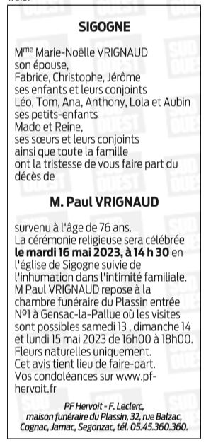 Cet espace « condoléances » est dédié à la mémoire de Monsieur Paul VRIGNAUD.