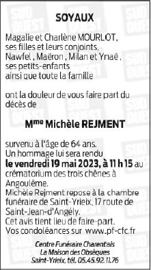 Cet espace « condoléances » est dédié à la mémoire de Madame Michèle REJMENT.