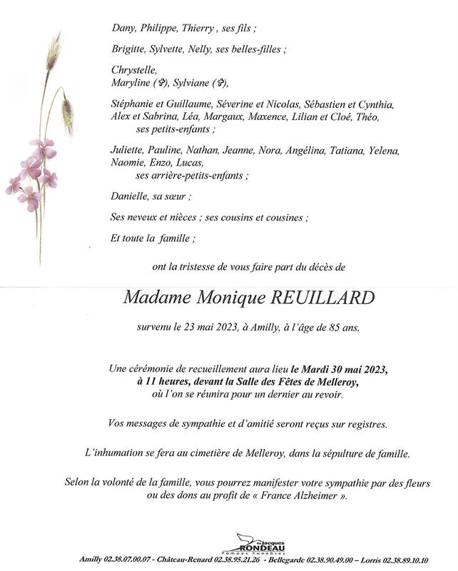 Cet espace « condoléances » est dédié à la mémoire de Madame Monique REUILLARD née PINON.