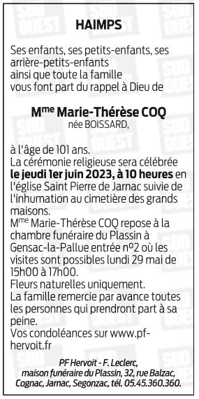 Cet espace « condoléances » est dédié à la mémoire de Madame Marie-Thèrese COQ.
