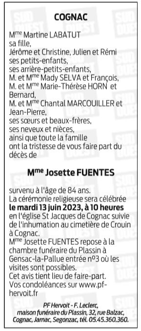Cet espace « condoléances » est dédié à la mémoire de Madame Josette FUENTES.