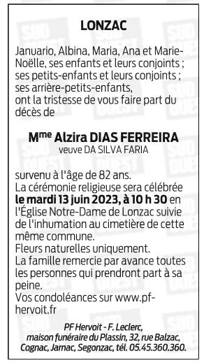 Cet espace « condoléances » est dédié à la mémoire de Madame Alzira DIAS FERREIRA.