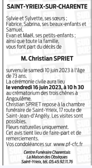 Cet espace « condoléances » est dédié à la mémoire de Monsieur Christian SPRIET.