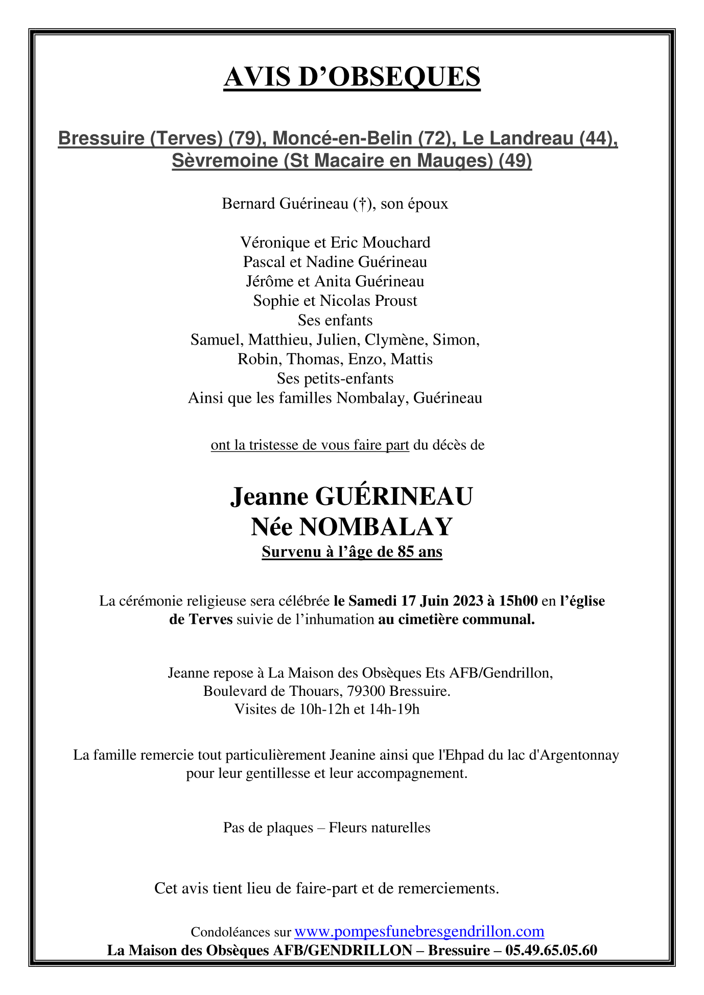 de Madame Jeanne GUÉRINEAU née NOMBALAY