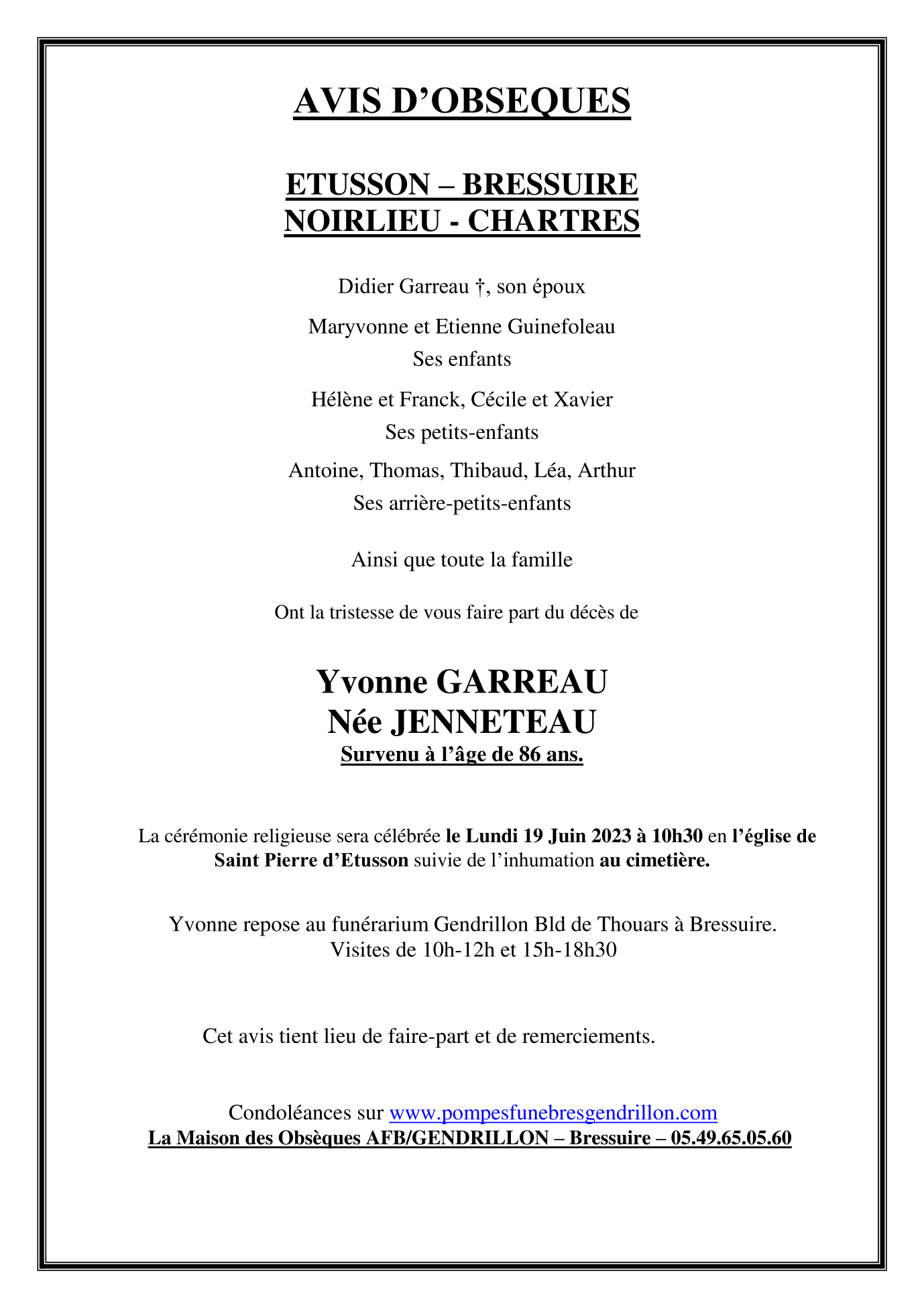 de Madame Yvonne GARREAU née JEANNETEAU