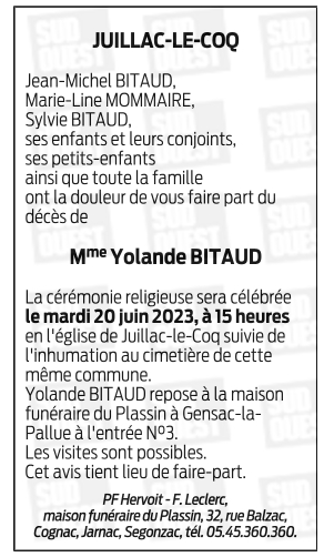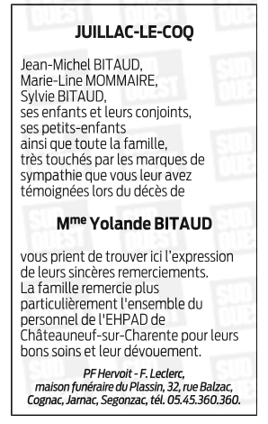 Cet espace « condoléances » est dédié à la mémoire de Madame Marcelle BITAUD née NEVEU.