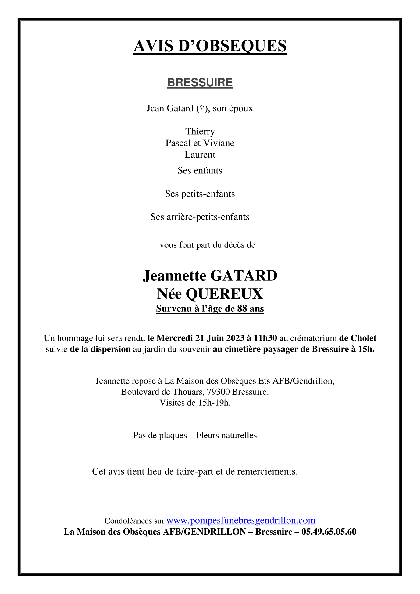 Cet espace « condoléances » est dédié à la mémoire de Madame Jeanne GATARD née QUEREUX.