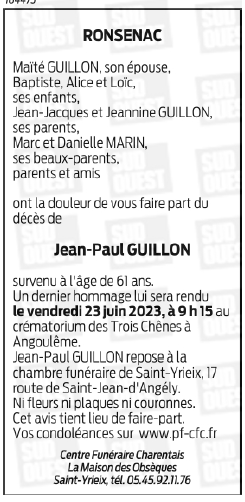 Cet espace « condoléances » est dédié à la mémoire de Monsieur Jean-Paul GUILLON.