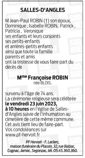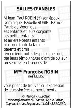 Cet espace « condoléances » est dédié à la mémoire de Madame Françoise ROBIN née BLOIS.